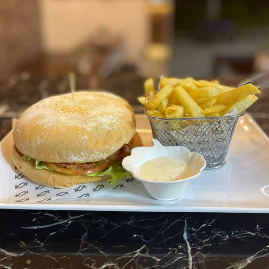 Pan artesanal, carne artesanal, tomate, cebolla caramelizada, queso, pepinos agridulces y tocineta.