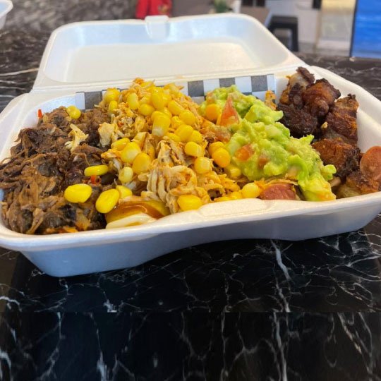 Carne desmechada, chicharrón frito, papa criolla o a la francesa, pollo desmechado, maíz tierno y guacamole.